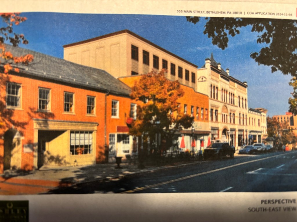The brick parapet above the former Woolworth would remain. Part of the rear addition to the building will be visible from the Colonial Industrial Quarter, the old Moravian part of Bethlehem that received UNESCO World Heritage status this year.
