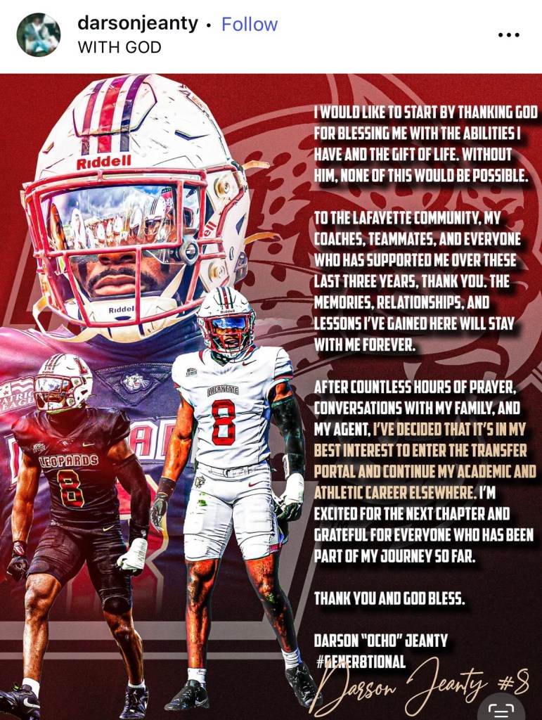 Lafayette College football player Darson Jeanty has entered the transfer portal, according to his post on social media.