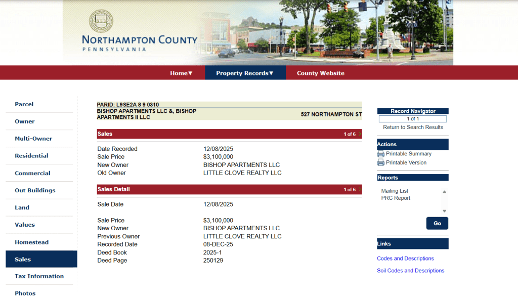 Northampton County recorded the sale as of Dec. 8. The property has 20 total units and floor area of 14,441 square feet. The last sale was for $1.7 million in 2019.
