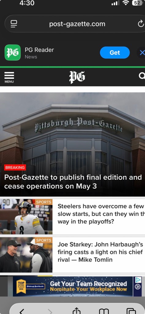 what a sad day for the 4th estate Was as an avid reader of the Post Gazette for many years.