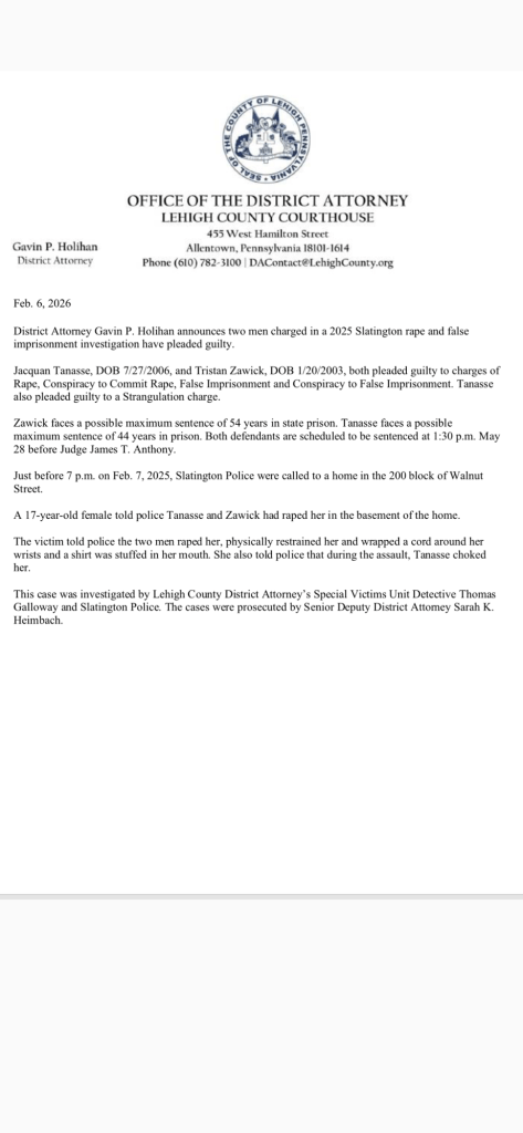 Two young men may face lengthy prison sentences after pleading guilty to a rape and false imprisonment in Slatington, Lehigh County District Attorney Gavin P. Holihan said in a press release today.