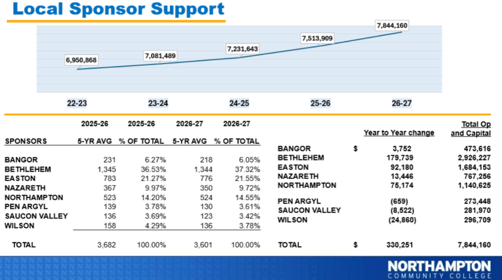 Bethlehem Township-based NCC projects an operating budget of $85.5 million, and a capital budget of $8.7 million. NCC is looking for $7.84 million from local school districts, including $2.93 million from the BASD, based on the chart below, from a presentation in the Monday agenda.
