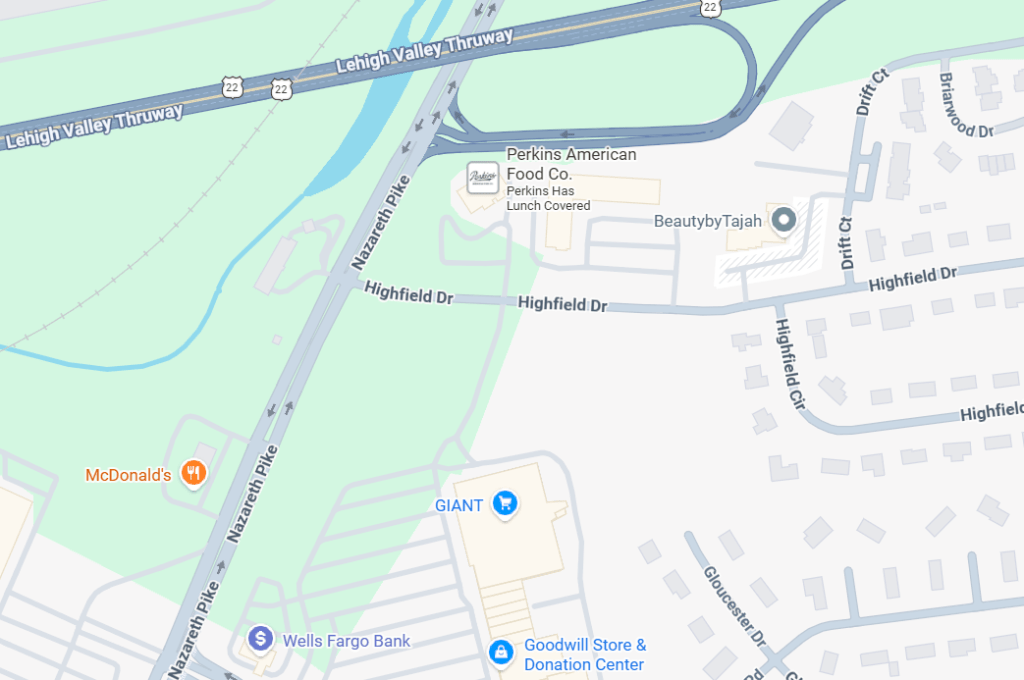 That intersection is just north of the Bethlehem Square shopping center and just south of the intersection with Route 22. It’s a difficult left turn, whether going east onto Highfield, or left out of Highfield. Across the street is a car wash, and then McDonald’s.