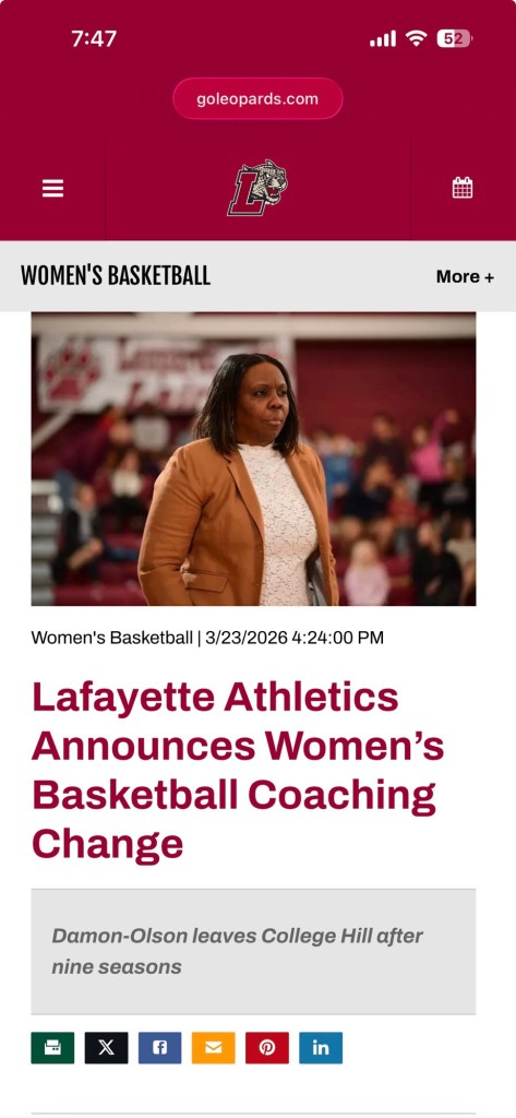 Lafayette College won’t bring women’s basketball coach Kia Damon-Olson next year.
