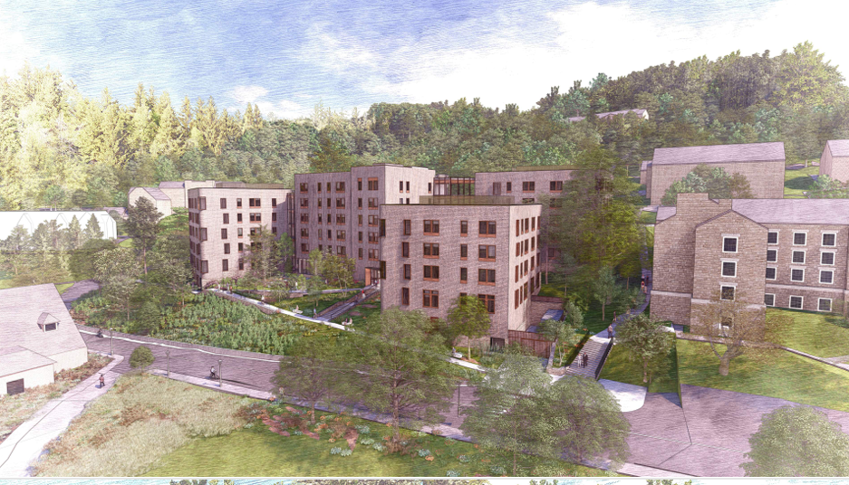 East Hill Residence Halls will be a new, ground-up 370 bed student dormitory with first floor amenity space (lounge, gaming area, multi-purpose room, kitchenette, and laundry facilities). Nestled in trees and native plants on South Mountain, the project has a LEED Silver or higher sustainability goal. The building will be fully-electrified and a high priority will be placed on occupant health and wellness.
