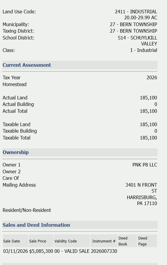Berks County property records show a $5.1 million sale of the land as of March 11: